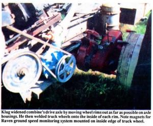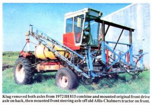 "We needed more capacity and wider booms than our Deere 6000 Hi-Boy sprayer," says Klug, who built the unit with help from sons Tom and Bill. "It had a 300-gal. tank and 60-ft. wide boom. I used this new rig to spray about 1,500 acres on my farm last year and did another several hundred acres of custom spraying. On a good day I can spray 40 or 50 acres per hour at 6 mph. At 20 gallons per acre I can go almost 40 acres without refilling. A bigger tank would be nice but might be too heavy for muddy fields. Mounting the drive axle in back and steering axle in front makes it easier to handle. Weight of the engine and spray tank "Visibility from the cab is excellent. Because the sprayer has the combine's hydrostatic transmission, I can operate at variable speeds for different rates of application. The rear-mounted engine is very accessible for changing oil and for general maintenance. The combine's original gas engine wore out so we replaced it with a used 6-cylinder diesel engine.