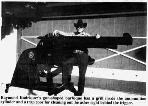Gun-Shaped Barbeque AG WORLD Ag World 14-5-20 "Fire up the grill," has a whole new meaning for Raymond Rodriquez since he built this gun-shaped barbeque that's got a grill in-side the ammunition cylinder and a trap door for cleaning out the ashes right behind the trigger. When it's cooking, smoke pours out the barrel.