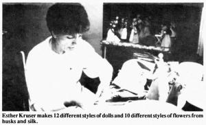 Kruser, who displays and sells her wares at art and craft fairs, specializes in finely-detailed cornhusk dolls and realistic, multi-colored flowers. She makes 12 different styles of dolls and 10 different styles of flowers. She gets most of the husks and silk she needs from an acre of corn.