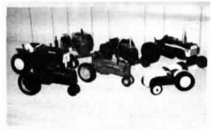 I hand-carve wooden tractors, combines, birds, fish, ducks, owls, etc., on consignment with such life-like detail that many people think I make them from kits. I've carved old Deere A and B, Farmall, and Allis-Chalmers tractors, two combine models, and a road grader and airplane. I recently carved a Massey Harris 33 tractor using photographs in a book. The combines are 2 ft. high and 3 ft. long complete with wooden wheels and grain auger. The wheels even have lugs. !generally use basswood to carve my models. Each model is hand rubbed and "burned", then painted. I'm now making an old-fashioned corn shucking wagon with big bang boards on each side and wooden spoke wheels. (Frank Gonsior, Rt. 2, Box 208, Central City, Neb. 68826 ph 308-548-2603).