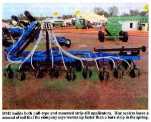 Tailor made strip till toolbars PLANTING EQUIPMENT Modifications 17-6-40 DMI builds both pull-type and mounted strip-till rigs that can be equipped to apply either dry fertilizer or anhydrous in the fall. All units are equipped with markers so you can lay out evenly-spaced rows to plant into the following spring. To apply dry fertilizer, a Concorde air unit is towed behind. Components include a 20-in. coulter, followed by a knife with beavertail sealer on bottom, and double disc sealers (to seal in anhydrous). The double disc sealers leave a mound of soil that warms up early in the spring. Residue mixed into the soil helps prevent erosion.