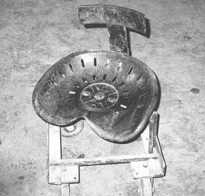 The chair's 16 in. sq. platform is made of feederhouse bars off an old International 1460 combine. Each corner is fitted with a 2 1/2-in. dia. rubberized caster wheel.