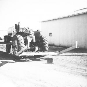 Prestin mounts the tile stringer on his Deere 4010 tractor. He buys 5- or 6-in. dia. plastic tile wound onto 10-ft. dia. reels.