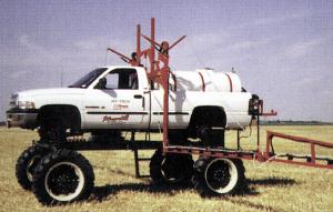It's a low-cost alternative to high priced self-propelled high-boy sprayers since most farmers already have a pickup.