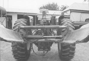 It consists of a pair of 12-in. high, 44-in. long steel arms that are opened or closed by a hydraulic cylinder. The arms are welded to a steel frame equipped with two lengths of steel tubing that slide in or out of a pair of 4-in. dia. pipes mounted crosswise behind the tractor. To load the bale Zimmerman opens the arms and lowers them to the ground, then backs up until the bale is completely inside the arms. Then he shuts the arms to "clamp" the bale and raises the 3-pt.