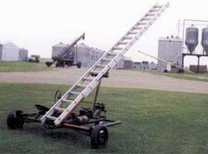 The ladder has a 13-ft. minimum height and extends to 36 ft. It tilts and telescopes with hydraulics. The hydraulic pump was taken from an old combine and is driven off the engine.