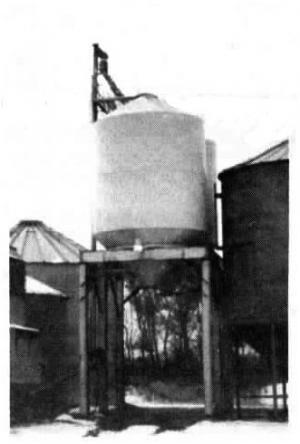 The "drive-under" bins are filled by a 35-ft. high vertical auger that runs from a dryer up to the bins. To load trucks, Safranski simply pulls a lever connected to a cable that opens a chute at the bottom of each bin.