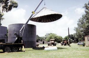 The bins were 24 ft. in dia. and 18 1/2 ft. high. A truck-mounted crane was used to lift the roof off each bin and set it on the ground. He first cut most of the bolts that held the roof panels to the side walls. In order to reduce the amount of time the rented crane had to be on the farm, he used a torch to vertically "stitch cut" the bin wall. On each side of the bin he made a 1-ft. long cut, then left 1 in. of material, then made another 1-ft. long cut, etc., leaving just enough material so that the bin would stand on its own. When the crane arrived, he removed the remaining bolts, hooked ropes onto the roof, and used the crane to lift the roof off. He then cut the 1-in. long "stitches" out of the bin walls and used the crane to lay each half down, with the cut side down, so that it could be hauled away by a loader tractor.