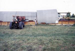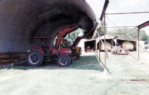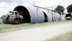 The four bin halves were placed into position and then bolted back together. One side bolts to the 4-ft. high wood wall. Once that side was in place, three loader tractors were used to lift the other side of the building so it could be tach-welded to a 10-ft. high steel frame that supports it. The last step was to apply silicone and roof cement between the bin sections.