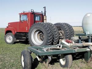 One of the most essential features of the truck-tractor is the air brake system. "We rigged up individual air brakes using the truck's original air system," notes Glen. "We can brake either side of the tractor individually or brake all four wheels at once. You have to be able to brake either side to make turns on headlands."