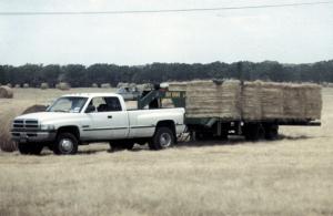 Developed by William Cheatham, the Hay Hawg will pick up and transport 10 big round bales behind a 3/4-ton pickup. Radio signals from the hand held remote, control every aspect of the machine.