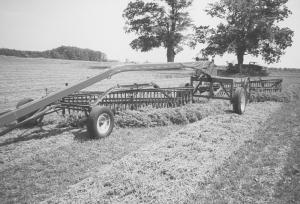 "I use older Deere side delivery rakes because they do a much better job fluffing windrows and are very gentle on hay. The rakes are also cheaper to operate since it's easy to find old rakes for parts.