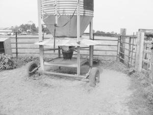 Wright started with a 10-ton feed bin that he got free from a neighbor. He removed the top two rings and then welded two of the bin's four legs to the axle and wheels off an old trailer. He used 2 by 4's and plywood to make a 4-ft. sq. "swinging" platform that mounts between the legs. Feed gravity flows out of a manually-operated slide gate at the bottom of the bin onto the platform, which is suspended at each corner by a chain. By raising or lowering the chains, Wright can change the rate at which feed comes out of the bin. A roof made from sheets of corrugated tin keeps the feed dry.