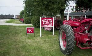 He displays all the tractors at an "open house" held for four days every August. This past year was his sixth annual show. The tractors are lined up in rows next to a busy highway, accompanied by a large sign that reads "Charlie's Home For Retired Farmalls." Each tractor has a sign indicating the year and model number.
