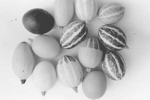 Through a breeding program, Brent Loy, a professor of plant biology at the University of NH, has developed several new strains of egg gourd that grow on more compact bush plants and sets a much heavier crown set of fruit that the original viny variety. "In addition, I have incorporated several colors and patterns into the egg gourds so that I now have a very colorful mix," says Loy.
