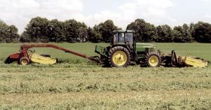 Bob Hoerth cuts hay front and back thanks to his front-mount New Holland Versatile and an older New Holland 1476 pull-type haybine. The two 16-ft. wide units let him cut a 32-ft. wide hay swath with every pass.