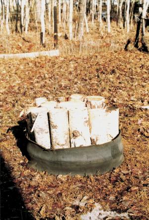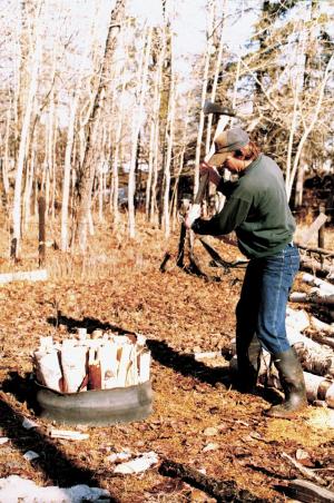 Bokenfohr uses a cut-down tire to hold a bunch of blocks to split all at once. He says an old car or truck tire (13 to 16 in.) works well and costs nothing. He removed the side walls with an angle grinder, making it possible to turn the tire inside out by hand. This also leaves a bigger space in the center of the tire to hold more wood.