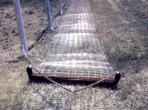 The fence stretcher consists of two long metal bars - a pulling bar made from 2 by 2-in. metal tubing, and a gripping bar which has a series of metal prongs on it. A chain hooks to both ends of the pulling bar and to the back of a pickup or tractor.