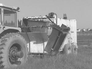 The first step was to cut the top off to make it easy to fill. They then mounted it on a Deere 300 stackwagon bed. Palechek figured that the walking beam axle would spread out the load on soft ground in the spring.