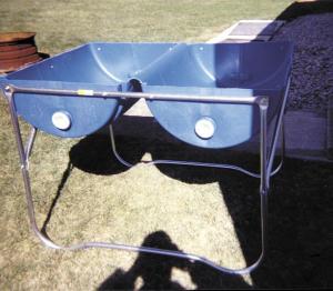 I made a roomy double wash tub that's easy to clean out by cutting a 55-gal. drum in half lengthwise. I left it connected on one side and bent it back, mounting the two half-barrel tubs on a stand made out of metal conduit. The tubs are easy to clean off by unscrewing the caps at one end. (Richard Faber, Tiffin, Ohio)