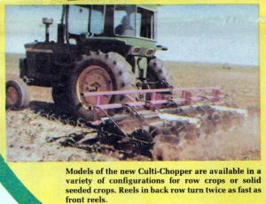 The one machine does the work of four or five and is tailored for both row crops and solid seeded crops. For row crops, it's made up of reels which match your particular row width. For example, you can buy a CultiChopper designed to cover up to 12 30-in. rows at a time. If you irrigate, the machine can be used with bedding equipment to prepare the seedbed and also to cultivate the bedded crop.