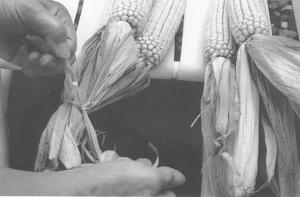 Bundle processing involves three steps. First, the ear is inspected as the husk is pulled toward the butt of the ear to fully expose the kernels. Only ears that have an attractive color and are filled to the tip are selected for placement in the bundling rack, for matching with other ears of the same size. Next, the husks of the various groups of three ears are held tightly as they're securely tied with colored ribbon. Complimentary second colored ribbons can be used and draped down to add attractiveness to the bundle. Last, the finished Decco Corn bundles are packed tip down into delivery boxes for transport to retailers.