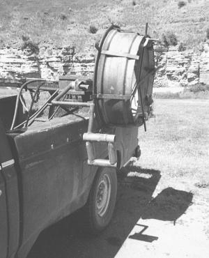 To remove the wire rolls, he swings the rim down to the ground behind the pickup with the bale arm. He unbolts the strapping holding the wire on the rim and slips the neatly rolled wire off. He bolts the strapping back on, swings the rim back in place, and he's ready to go again.