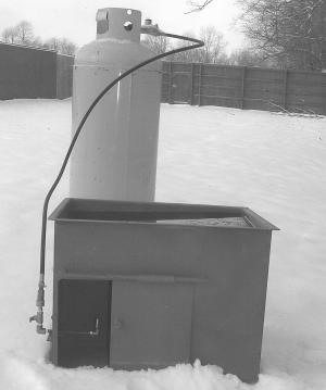 The burner sets inside a metal box welded to one corner of the tank. The box has a sliding door on one side that can be opened to provide air to the burner. To heat the water you simply open the valve on the propane tank and then hold a match to the burner.