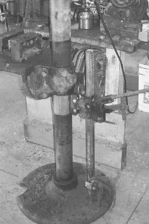 Richard Heimberger, Lucas, Ohio: "I have an old drill press with a table that's adjustable up and down. There was no way to move it except by hand, which was very difficult as the table is heavy, especially with the vise attached to it. I adapted an old lever jack from a 1965 Plymouth car to make a device that I use to raise and lower the table. I made a sleeve to go around the post so it's loose enough to slide and attached the jack to it. Now I can easily place the table to any height I want. The table is still free to swing to any desired location, as it rides loose on top of the sleeve."