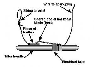 "Take an old piece of hacksaw blade about 2 in. long. Cut a piece of electrical wire long enough to go from the spark plug over to handle of tiller. Bare both ends of wire. Wrap one end around top of spark plug. Put spark plug wire back onto spark plug. Wrap other end around piece of hacksaw blade. Wrap handle with electrical tape about 1 in. wide and then tape the end of the hacksaw blade with wire on it to the taped handle so it's insulated from the handle. Leave the other end of the blade laying against the bare metal of handle and bend the end of the blade slightly so it makes good contact. Attach a string to a small piece of leather. Put the leather between the blade and the bare metal of the handle. Tie the other end of the string to your wrist or belt. When the leather is pulled from under the bare end of the hacksaw blade, it will short out the spark plug, killing the motor."