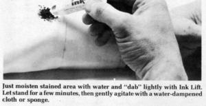 The stained area is first moistened with water, then dabbed with the wax-like Ink Lift to dissolve the ink. The treated area is then gently agitated with a water-dampened cloth or sponge and the stain disappears.