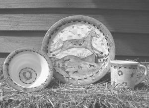 Besides selling designs to companies, she does a lot of commission work including painting portraits for people throughout the U.S., based from photos mailed to her. She recently started a new line of greeting cards and kid's dishes under her own name.