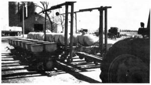 To fold the planter for transport, Larson puts the tractor in neutral and uses the planters' original lift cylinders to raise the planters, then unplugs the hydraulic lift hoses and plugs in the hoses that operate the folding cylinders (his tractor doesn't have enough outlets for both sets of hoses). He swings both planters inward until they're tight against the hitch, then pins on a crossbar to tie both planters together. He lowers the 3-pt. to set the dolly wheels on the ground and chains the planters' lift wheels in place. He then raises the 3-pt. to lift both planters.