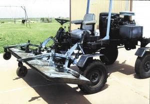 The machine rides on four 15-in. car tires and is equipped with a home-built, PTO-driven deck that has five 22-in. lawn mower blades. The deck can be hydraulically raised up to 2 ft. off the ground. A home-built canopy keeps the driver in the shade.