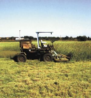 The machine rides on four 15-in. car tires and is equipped with a home-built, pto-driven deck that has five 22-in. lawn mower blades. The deck can be hydraulically raised up to 2 ft. off the ground. A home-built canopy keeps the driver in the shade.