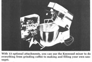 You've never seen anything like the new heavy-duty Kenwood food mixer. Besides performing as a conventional mixer, there are 13 optional attachments, including: A complete food processor, juice separator, meat grinder, sausage stuffer, wheat mill, potato peeler, coffee grinder, colander and sieve, blender, can opener, and cream maker.