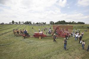 This $6,200 forecart from I&J Mfg. makes baling hay with horses easy. The 35 hp gas engine, hydraulic brakes, steering and stabilizer provide the power and load handling on this New Holland BC5050 baler and hay basket. Jake Blank, I&J, says the forecart works equally well on haybines, corn pickers and rotary mowers.