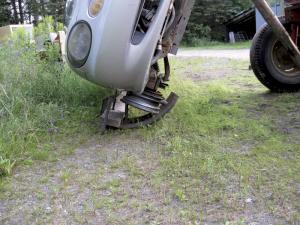 A third problem involved lifting the car. Instead of hoisting it from a wheel on the soon to be "high" side, he now removes the former lift wheel and bolts a steel bar to the under-frame. Using a bar slightly longer than the underside of the car is wide gives him a lift point that is safely removed from the car body. Finally, he puts two posts under the car to hold it in place.