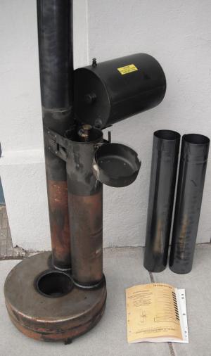 The 55-lb. heaters are about 3 ft. tall and come with four 2-ft. sections of 4-in. stovepipe. Fill the 2.2-gal. tank with any type of fuel from gas to diesel to biodiesel and hook it on to the unit. Set the valve to drip as little or as much as you want and drop a match to light it. Fuel drips on the cast iron plate in the donut at the bottom, and the fuel feeds the flame, consuming less than a gallon of fuel an hour.
