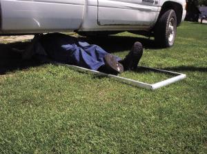 The "Super Creeper" is designed with a 4-ft. long movable bed that rolls on wheels inside an 8-ft. long metal frame. Both ends of the frame are rounded and slide easily over rough ground as you shove the frame under the vehicle. The frame folds in half for easy carrying and storage. The entire unit weighs about 38 lbs.