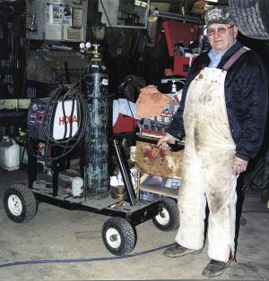 “I stripped the riding mower down to the wheels, axles and frame and welded a metal box on back of the frame to hold the welder. The tank sets in a welded-on round metal tray, and is supported about halfway up by a U-shaped metal bracket with a chain welded onto it. The bracket is welded to the top of the mower’s steering column. I replaced the mower’s steering wheel with a handle made from 1-in. dia. tubing.”