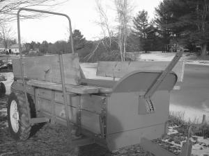 The rear part of the manure spreader was modified to include a set of stairs that can be raised or lowered from the tractor seat. The tractor driver reaches back and pulls on a lever on front of the spreader, which allows people to easily enter or exit the wagon. The lumber for the bench seats and body of the spreader was cut, milled, planed and finished on site.