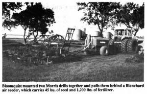 Air seeder built from drills HITCHES Hitches 17-1-26 "It works as good as any air seeder on the market. I spent only $8,500 to build it," says Rudi Bloomquist, Starkweather, N. Dak., who converted two 11-ft. Morris hoe drills into a state-of-the-art air seeder by removing the seed boxes and metering drives and mounting a pair of seed-distributing manifolds on the drill frame. A two-compartment Blanchard air seeder caddy delivers seed and fertilizer to the manifolds which then distribute them through tubes to each hoe opener.