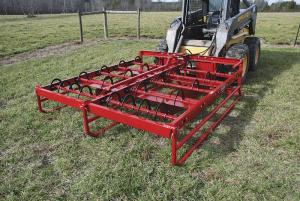 The patent-pending Accumagrapple is designed to mount on front of any skid loader or tractor loader and handles 8 to 10 small square bales of hay at a time. Bale size can vary from 36 to 42 in.
