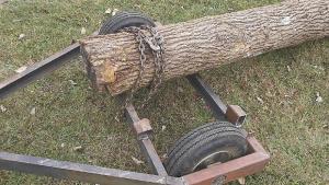 He uses his Suzuki King Quad 4-WD ATV to pull the 2-wheeled skidder, which rides on a pair of 10-in. wheels. The front end of the log is chained to a cross member located just ahead of the wheels.