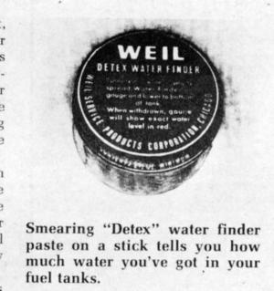Detex paste comes in 21/2 oz. jars and you use "just a dab at a time", according to R. A. Weil, sales manager. Retail price is $1.95 a jar. Another paste product that does just the opposite - finds gas or diesel fuel in water tanks - sells for $2.25 a jar. For more information on Detex paste, contact: FARM SHOW Followup, Weil Service Products Corp., 2434 West Fletcher, Chicago, Ill.