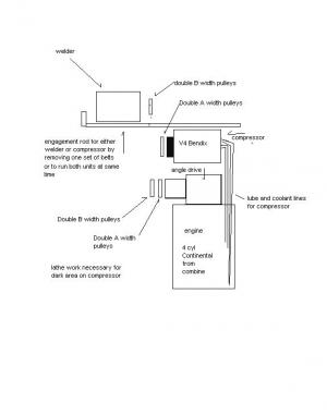 Brakefield reworked the input drive on the compressor with parts from Detroit Diesel. With some lathe work, he was able to make a drive coupling for the Bendix and mount a double A width pulley to it. The welder has a double B width pulley on it. He mounted A and B width pulleys with a spacer between them on the Continental’s pto shaft. The Continental also provides cooling and lubrication for the Bendix.