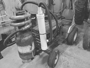 Gas runs things through two, 2-ft. long, 4-in. diameter, pvc pipes. They are connected in series and mounted to each side of the tractor. The gas travels first through one with a sock filter in it to trap larger particles. From there the gas continues to the second tube, which is filled with 1/2-in. thick sponge foam rolled up like a tube. It is designed to filter out finer particles.