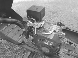 Davis replaced the Wheel Horse engine with a 6 1/2 hp. Honda clone. The belt drive connects to the transaxle. He fabricated a carburetor to better match the engine to the charcoal gas output. He also advanced the timing.