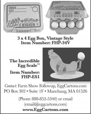 EggCartons.com offers a complete line of cartons along with everything you need to set up your own egg business. Contact: Farm Show Followup, Egg Cartons.com PO Box 302 Manchaug, MA 01526. Phone 888-852-3340 email@eggcartons.com, www.eggcartons.com